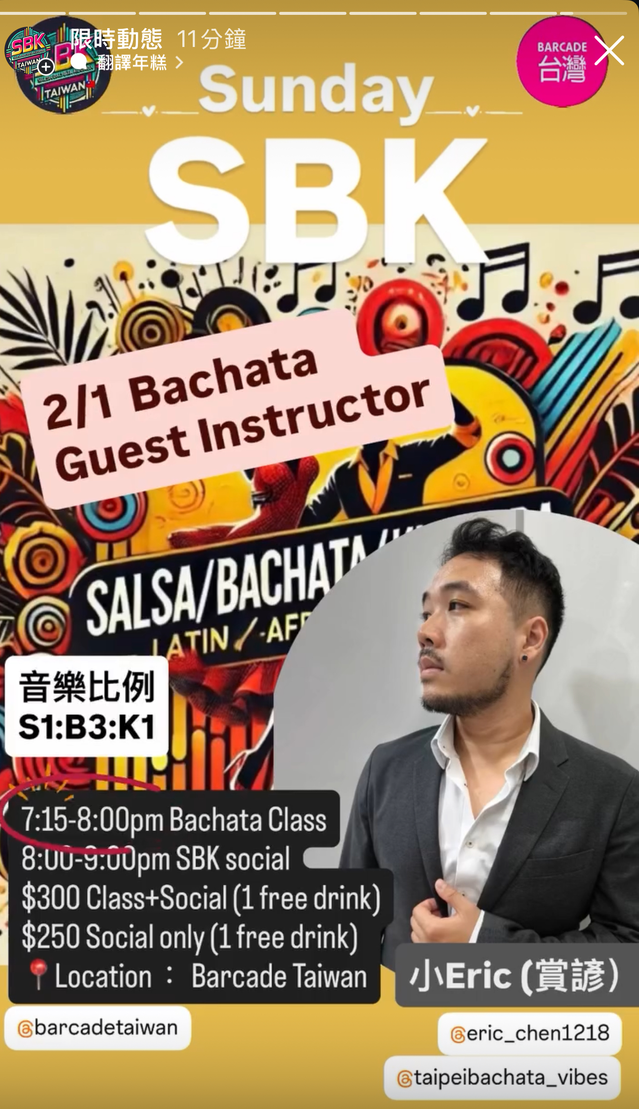 💥 本周日特別邀請小Eric(賞諺)老師教授Bachata, 程度適合open level的舞者,機會難得,不要錯過了!